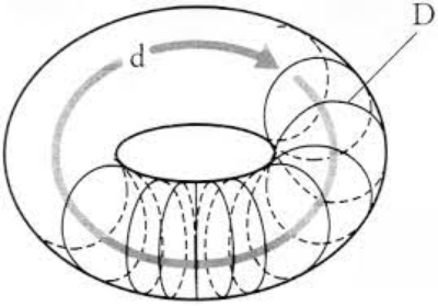 “La figura del toro es la superficie obtenida por la rotación de una circunferencia alrededor de una recta situada en su plano, sin tocarla”(4). Es por esto que el toro corporiza la propiedad de “centro exterior” en una estructura, porque si lo sumergimos en un ambiente, el espacio de su agujero central se trata del mismo que la exterioridad periférica (en torno al toro). Un exterior que le es central, un adentro hecho del afuera.
