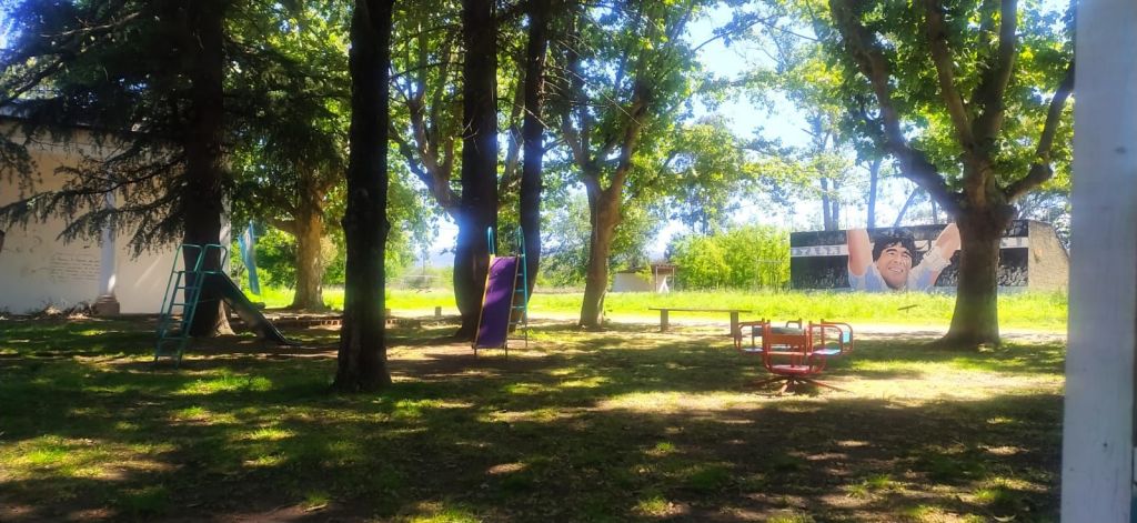 En Refugio Libertad hay una biblioteca, un salón de usos múltiples que, entre otras actividades, recibe un bachillerato de adultos. Hay un espacio donde dan clases de tela, una cocina, un aula para infancias, una placita con juegos y un mural con Maradona bendiciendo la osadía. Hay fibra óptica, bien indispensable en zonas rurales, que el equipo técnico habilitó en lo que fuera el tanque de agua y una suerte de torre de vigilancia. Qué prodigiosa burla a la funcionalidad, la de esa arquitectura de control transformada en fuente de conexión.