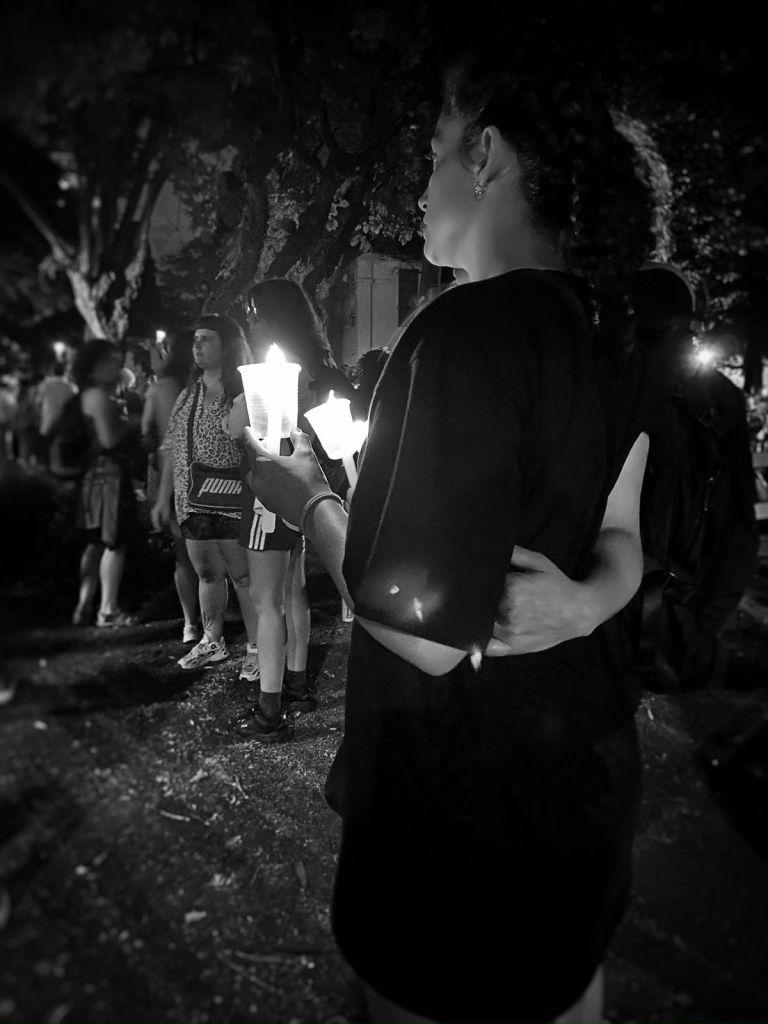 Llega la noche. Luna creciente. Enorme, algo anaranjada. Corona el escenario. Habla Taty Almeida y entonces se encienden miles de velas. Las llamas, custodiadas en precarios vasitos o cualquier recipiente a mano para que no se apaguen. Las velas no se tiran, se destinan de modo espontáneo a construir pequeños fueguitos que rodeen las palabras que circulan en pequeños volantes cuadrados: “Encender el fuego de la memoria para que no arrase el olvido”.