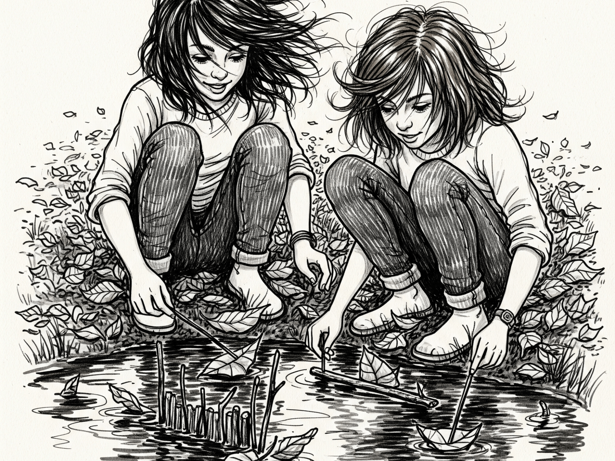 Para explorar esta dimensión, traigo a cuento otra escena, una que funciona como contrapunto a la imagen agustiniana. Dos nenas desconocidas se encuentran ante un charco de lluvia. Una sostiene una rama seca, la otra se acerca con curiosidad luminosa. Sin palabras, comienzan a trazar círculos en el agua. Las ondas se multiplican, se encuentran, crean patrones imposibles de prever.