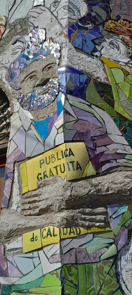Coronando la pared entre la puerta de Artigas y un ventanal, resalta lo bello la única imagen con rostro de mosaicos y colores, abrigada por un marco hecho de hierros que se doblan y entrelazan como si tuviesen la levedad de las espigas. En la esquina, una pirámide humana se alza hasta el techo, sostienen con sus cuerpos la frase que encabeza el mural La igualdad como premisa, no como promesa de J. Rancière. En la puerta de esa ochava, en el filo mismo de la pared, se recorta el perfil del rostro de un niño que parece atento al cartel que abraza un hombre a su izquierda donde se lee Pública, gratuita de calidad.