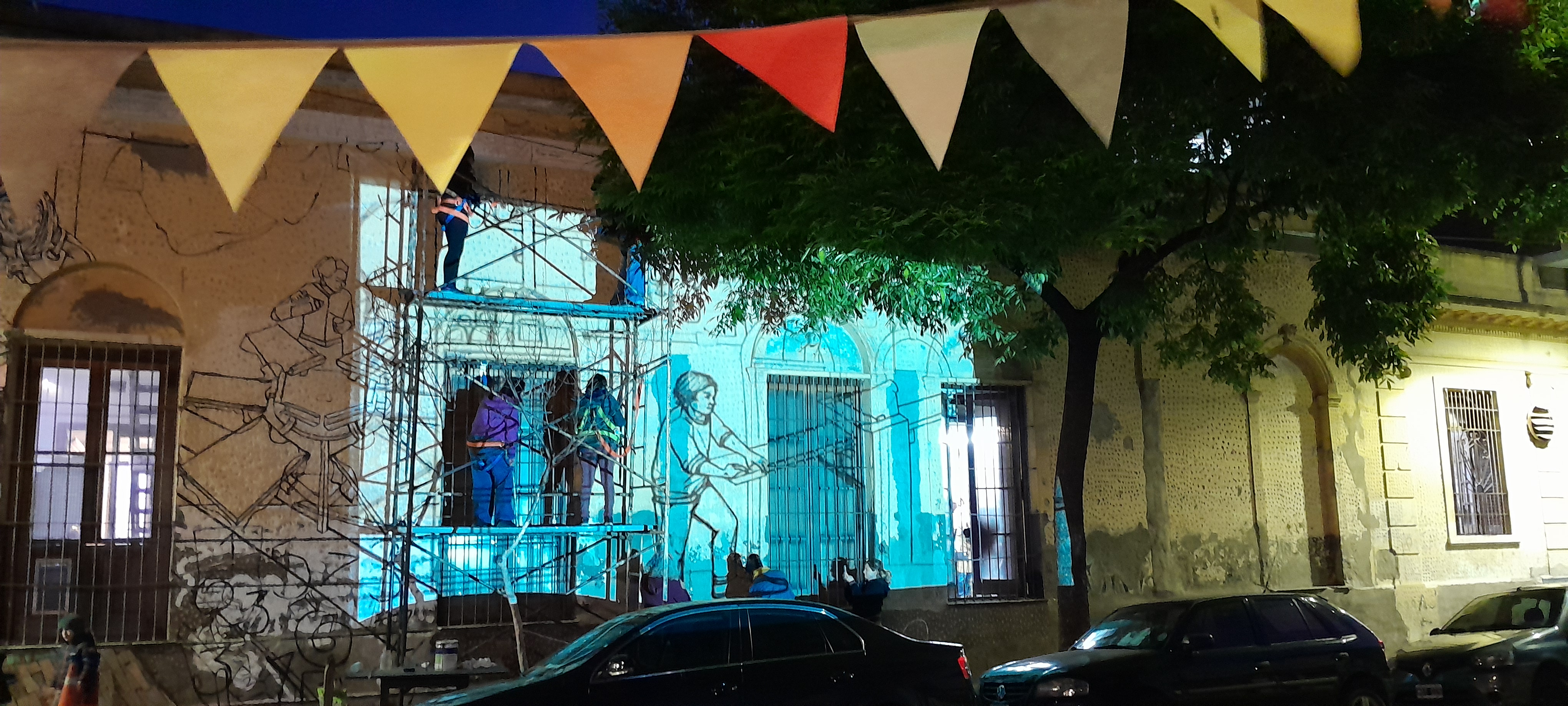 Repentinamente la calle se vuelve cine y la proyección es musicalizada al compás de los pinceles que calcan sobre la pared el boceto que es ampliado a escala, hasta lograr la ubicación que desean. Un proyector y una computadora sobre la vereda que está frente a la pared de la escuela sobre la calle Morón. Luego un andamio, una mesa con tarros de pintura y pinceles largos como la alegría de los vecinos que llegan y toman asiento en el cordón de la vereda, en los escalones de las casas, con sus niños, algunos caminando, otros en bicicleta. Una vecina reparte entre los muralistas alfajores de maicena preparados para la ocasión.