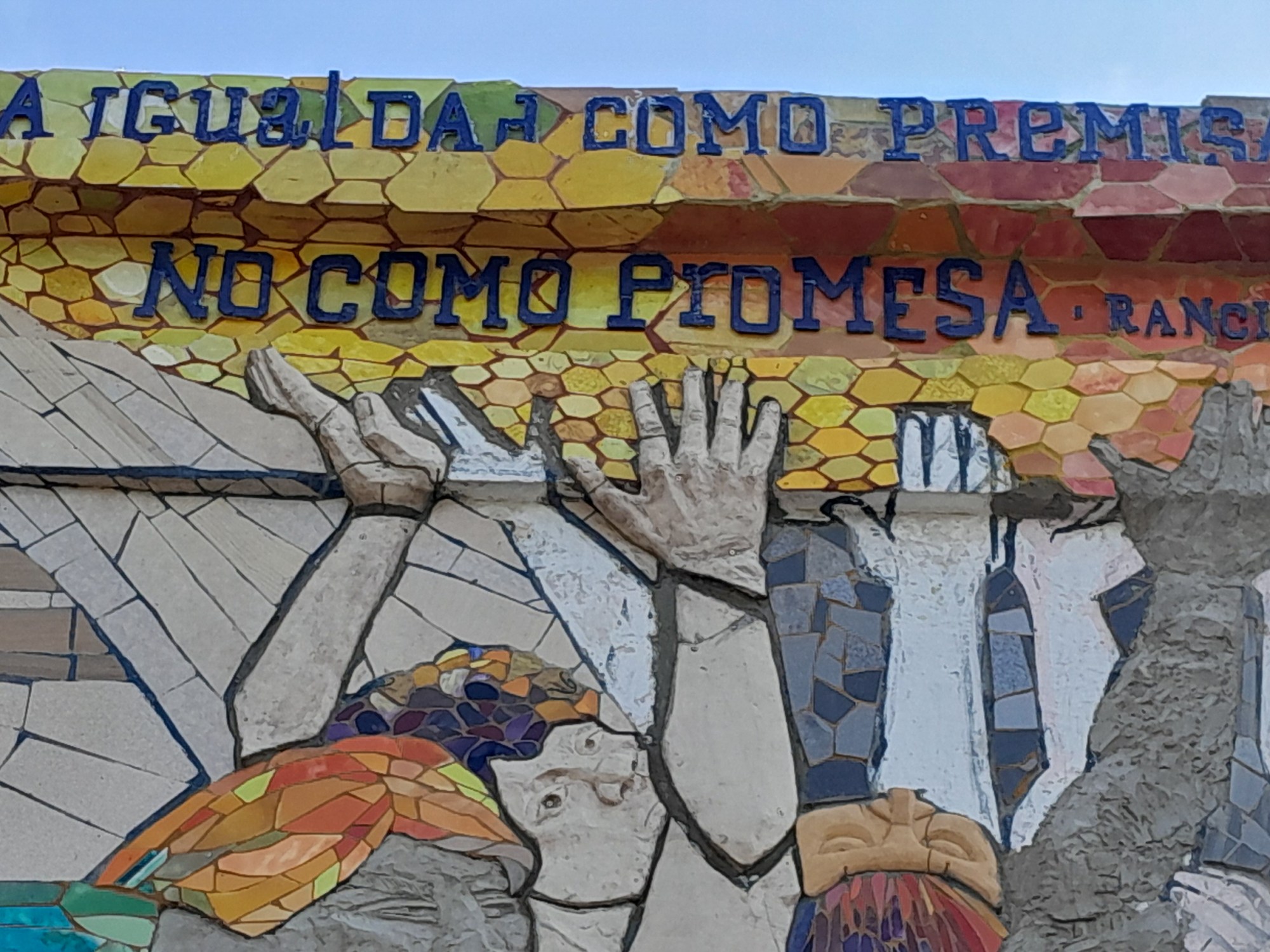 Coronando la pared entre la puerta de Artigas y un ventanal, resalta lo bello la única imagen con rostro de mosaicos y colores, abrigada por un marco hecho de hierros que se doblan y entrelazan como si tuviesen la levedad de las espigas. En la esquina, una pirámide humana se alza hasta el techo, sostienen con sus cuerpos la frase que encabeza el mural La igualdad como premisa, no como promesa de J. Rancière. En la puerta de esa ochava, en el filo mismo de la pared, se recorta el perfil del rostro de un niño que parece atento al cartel que abraza un hombre a su izquierda donde se lee Pública, gratuita de calidad.