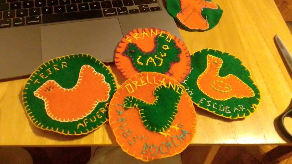 “La frase me aceleró el corazón” expresa Laura. Juan le envía fotos y audios a Gabriel. Aún dábamos puntadas cuando nos llegaron sus resonancias. Con las marcas sensibles de ese tejido invisible que se iba armando, nuestras manos comenzaron a bordar los nombres de Pichón, de Franco Casco y de Bocacha en las palomas de pañolenci que nos habían servido para practicar el punto festón.