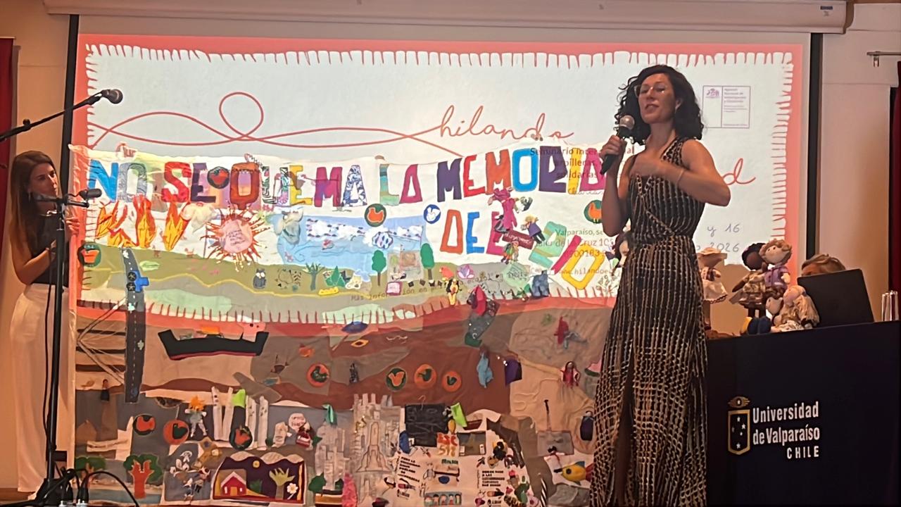 Para compartir la experiencia de «No se quema la memoria del río» tuvimos el privilegio de ser acompañadas por la música y el canto de Catalina Calvo, amiga de Soledad que, desde Bariloche, había llegado a las tierras chilenas y se hizo presente en el seminario. Nos regaló sus canciones para la apertura y cierre de nuestra participación. También nos acompañó Emiliano, de 8 años, que sostuvo amorosamente la arpillera. Las voces de algunas que estuvimos presentes se abrieron en representación de todxs aquellxs que habían dejado sus marcas y trazos, con sus historias, para que la arpillera tuviera cuerpo colectivo y llegara, como destino, a participar en el país vecino.