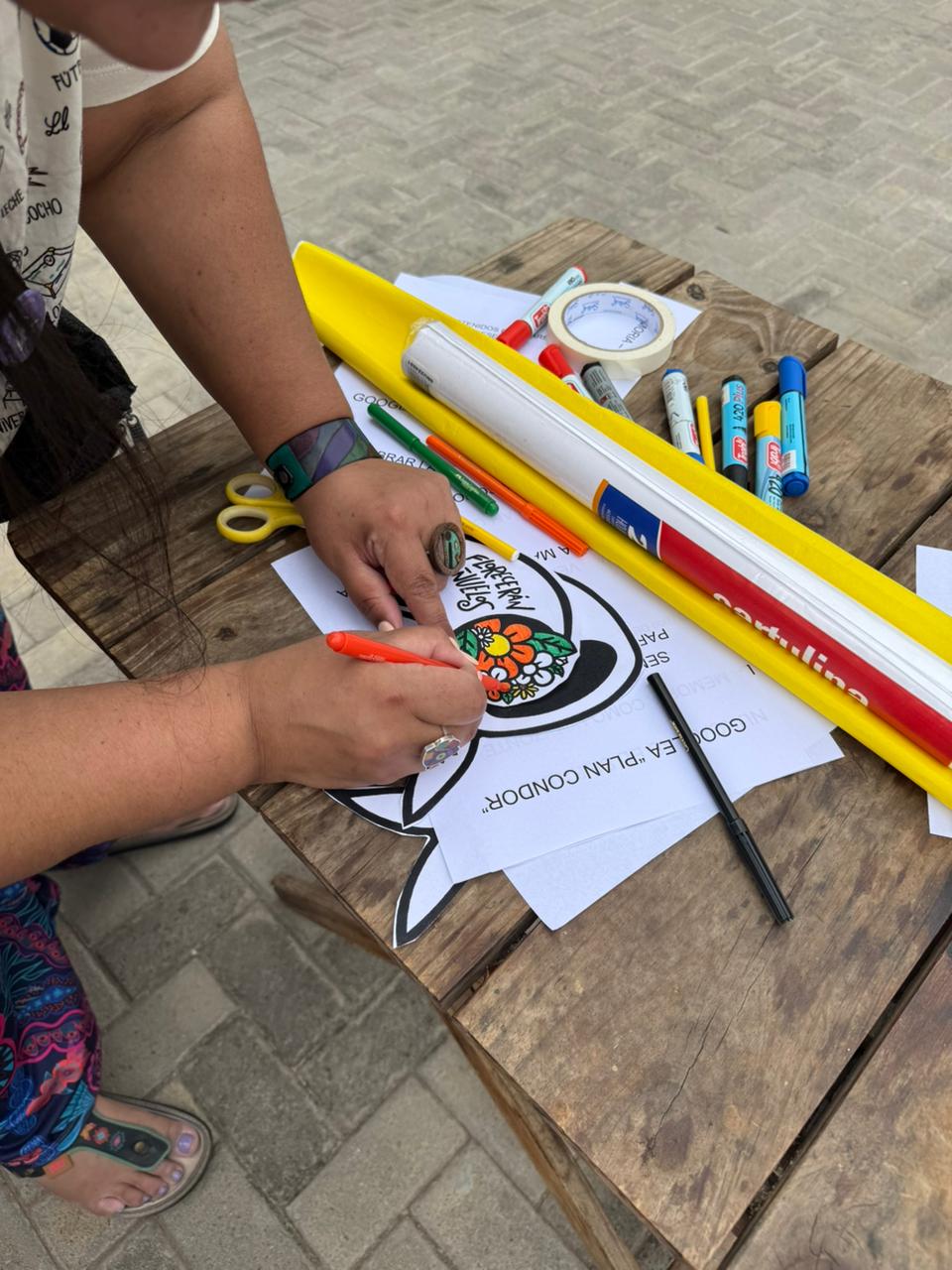 Arranca la jornada. Empezamos a disponer el material, cortar las botellas, las telas, los pañuelos y las fibras para pintar y escribir. Lxs pacientes observan. Un compañero lxs invita a participar y comienza el intercambio sobre lo ocurrido en la última dictadura militar.