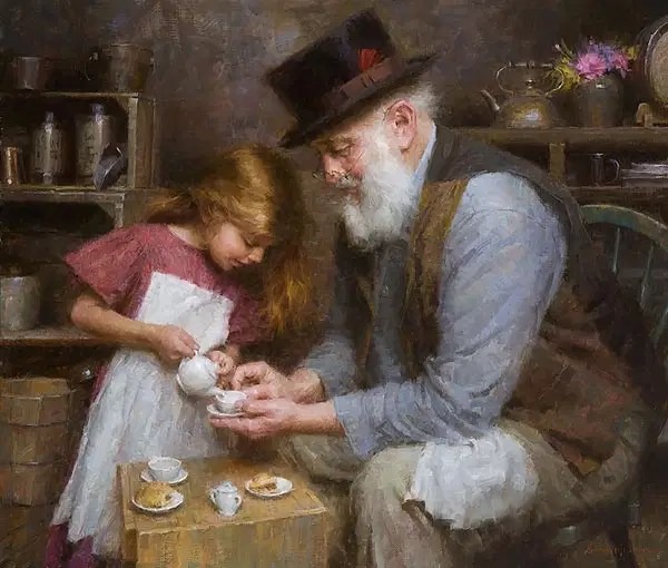 En esta película, la sangre está diluida en su repetición: es uno de los elementos que más aparece, tanto que hace casi obviarla[12]. Es decir, la sangre se nos presenta como familiar en tanto habitual. Recurro a algunas pinturas para proponer y acompañar algunos momentos de la película de radical contraste, donde el disimulo se queda corto. Para el primer segmento podemos apreciar la pintura de Morgan Weistling, Papa’s Tea: